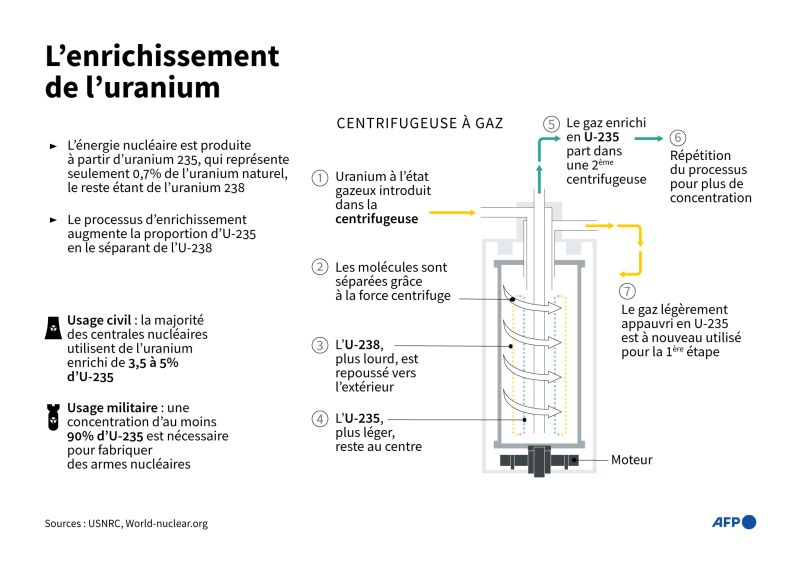 L’enrichissement d’uranium consiste à augmenter la proportion d’uranium 235, isotope fissile rare, dans l’uranium naturel. Cette opération est indispensable pour produire du combustible nucléaire civil (environ 3 à 5% d’U-235), mais au-delà de 90%, elle permet de fabriquer une arme atomique. La même technologie permet donc les deux usages, ce qui en fait un sujet hautement surveillé par la communauté internationale.