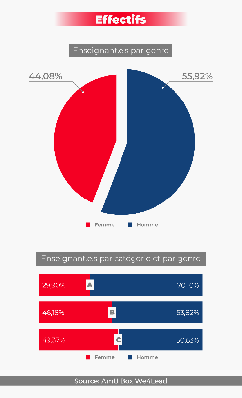 Les données genrées recueillies montrent une sous-représentation des femmes au niveau des effectifs généraux, laquelle est encore plus marquée dans la catégorie A, la plus prestigieuse, du corps professoral.