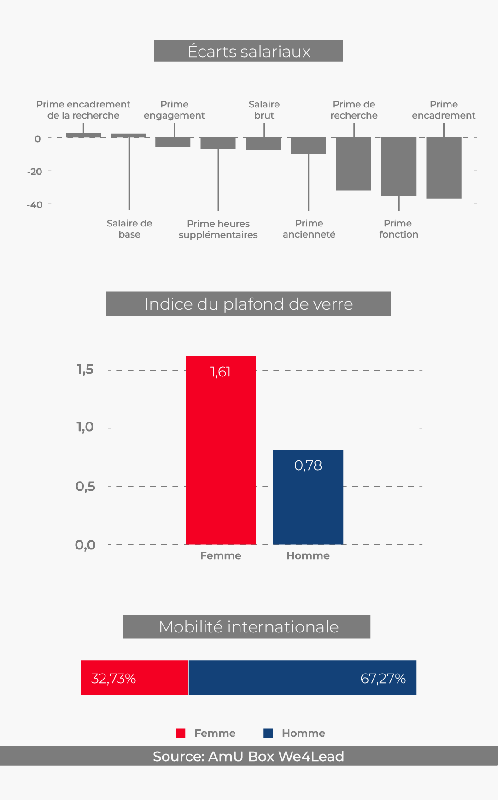 Dans ce cadre, des indicateurs essentiels de l’EFH ont été identifiés et quantifiés au sein de tous les établissements partenaires du projet: effectifs, écarts salariaux, mobilité internationale et représentation dans les postes à haute responsabilité (indice du plafond de verre).