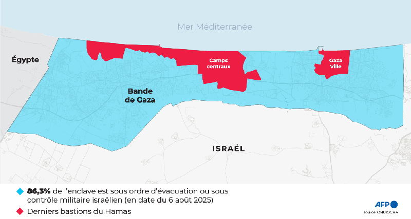 Lors d’une conférence de presse, lundi, Netanyahou a affirmé que «l’armée israélienne exerce son contrôle sur 75% du territoire», tout en exigeant «le démantèlement des derniers bastions du Hamas, principalement situés dans la ville de Gaza et dans certains camps de réfugiés du centre», tels que Nousseirat, Bureij, Deir el-Balah et Al-Mawassi. Selon le Bureau de la coordination des affaires humanitaires de l’ONU, 86,3% de l’enclave sont militarisés par Israël ou soumis à des ordres d’évacuation non révoqués.