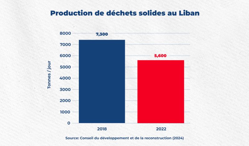 En 2018, la production nationale de déchets solides était estimée à environ 2.679.992 tonnes par an, soit environ 7.300 tonnes par jour, selon un rapport publié en 2024 par le Conseil du développement et de la reconstruction (CDR).