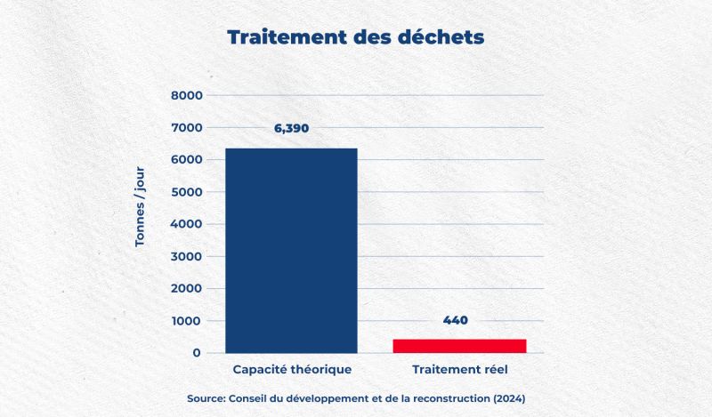 Selon le rapport du CDR, le Liban dispose théoriquement d’une capacité de traitement de 6.390 tonnes/jour, suffisante pour absorber la production actuelle, mais seules 440 tonnes par jour sont effectivement traitées, soit 7,9% des déchets générés, constituant seulement 6,8% de la capacité de traitement.