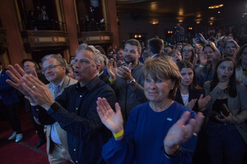 Les partisans de la Coalition Avenir Québec célèbrent la réélection de François Legault au poste de premier ministre du Québec au théâtre Capitole à Québec le 3 octobre 2022 (Photo by Alexis Aubin / AFP)Divisions