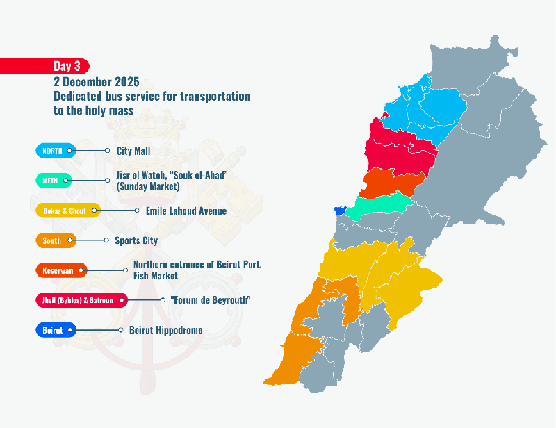 Citizens are invited to arrive from 5 a.m. to attend the mass in Beirut. Parking areas are planned for buses coming from different regions, followed by shuttle transfers to the site of the mass.
