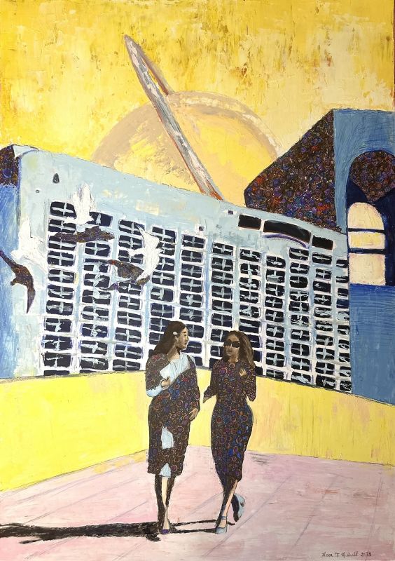 Les peintures ne gravitent plus uniquement autour de l’histoire du bâtiment. Le Holiday Inn devient un élément d’un vocabulaire émotionnel plus vaste, façonné par la diaspora, l’amitié, la nostalgie et la quête d’intimité à distance. Les figures symboliques, imaginées ou inspirées de personnes réelles de la vie de Mira el-Khalil, occupent désormais le centre de la scène. Elles conversent, marchent ensemble, négocient l’espace, regardent vers l’extérieur ou vers l’intérieur, ou se retirent dans la contemplation. Les objets deviennent personnages ; les espaces retiennent la mémoire ; la mémoire devient scène.
