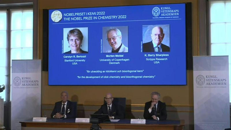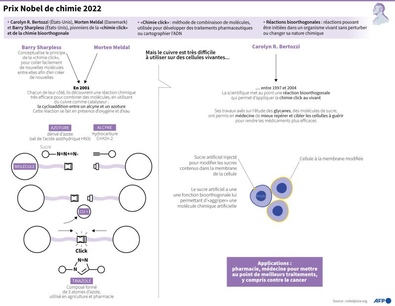 Le prix Nobel de chimie a sacré, le mercredi 5 octobre, trois pionniers de la chimie moderne: les Américains Carolyn Bertozzi et Karl Barry Sharpless, et le Danois Morten Peter Meldal. L’Académie royale des sciences de Suède a précisé, dans un communiqué, que ces chercheurs avaient «fait entrer la chimie dans l’ère du fonctionnalisme en posant les jalons de la chimie click». Introduit par Karl Barry Sharpless en 2001, cette science constitue un nouveau concept de la chimie de synthèse: elle consiste à produire rapidement et efficacement des intermédiaires synthétiques en assemblant différentes entités par des liaisons covalentes (liaisons moléculaires fortes), selon des réactions analogues à celles qui sont mises en œuvre par la nature. Cet assemblage moléculaire aurait déclenché un «effet boule de neige» dans le domaine, selon ladite Académie.