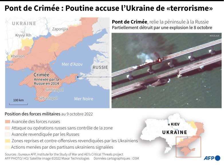 Le président russe Vladimir Poutine a accusé les services secrets ukrainiens d'être à l'origine de la puissante explosion qui a endommagé la veille le pont de Crimée. (AFP)M. Kuleba a expliqué sur Twitter avoir interrompu une tournée en Afrique pour revenir en Ukraine et être en "contact constant" avec les partenaires de son pays pour "coordonner une réponse résolue aux attaques russes". Selon lui, "Poutine est un terroriste qui parle avec des missiles".