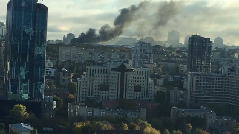 La fumée s'élevant de l'horizon de Kiev après des explosions.De son côté, la Moldavie a déclaré que "trois missiles de croisière lancés ce matin sur l'Ukraine par des navires russes en mer Noire" avait violé son espace aérien.