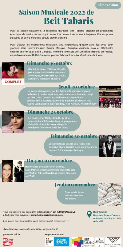 Oui, c’est très intéressant parce que les choses se sont faites naturellement et de façon évidente. Les jeunes interprètes libanais de musique classique manquent si cruellement d’espace musical et de vie musicale que, sans se concerter (et même parfois sans se connaître!), ont contacté Beit Tabaris pour savoir s’ils pouvaient s’y produire. Avec Joseph Maroun et Danielle Geahchan, nous avons décidé qu’après tout cela faisait partie de la mission du lieu, et nous nous retrouvons avec une véritable petite saison musicale! Quatre concerts, puis la master class et son concert de clôture, le tout en moins d’un mois!