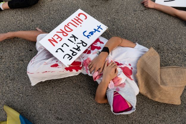 Une manifestante à Chypre simule une femme décédée avec son bébé."Mon combat contre les violences sexuelles, c'est vraiment un combat contre l'impunité", répète Pramila Patten, et "c'est la raison pour laquelle je me suis rendue en Ukraine (en mai dernier, ndlr): envoyer un signal fort aux victimes, leur dire que nous sommes avec elles et leur demander de briser le silence. Mais aussi envoyer un signal fort aux violeurs, le monde est en train de les regarder, et ce ne sera pas sans conséquences de violer une femme ou une fille, un homme ou un garçon".
