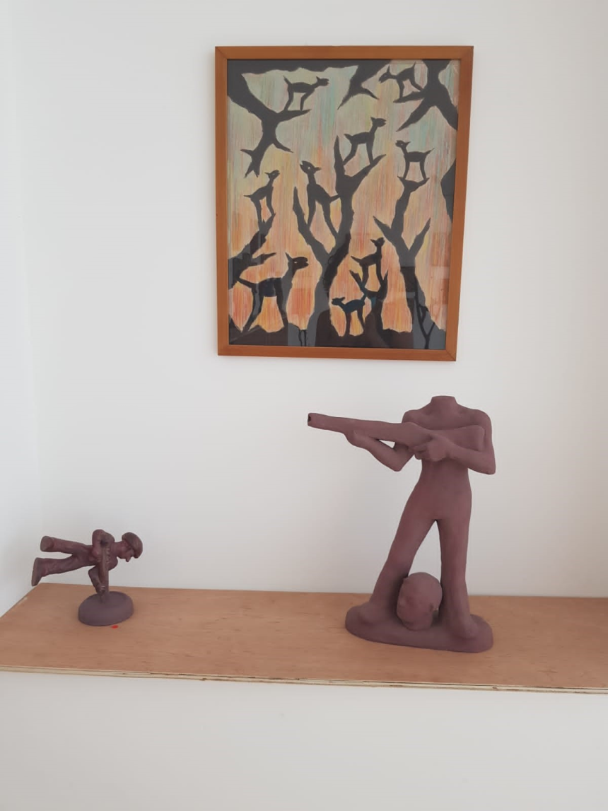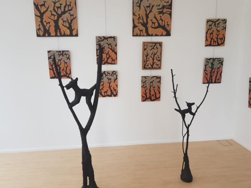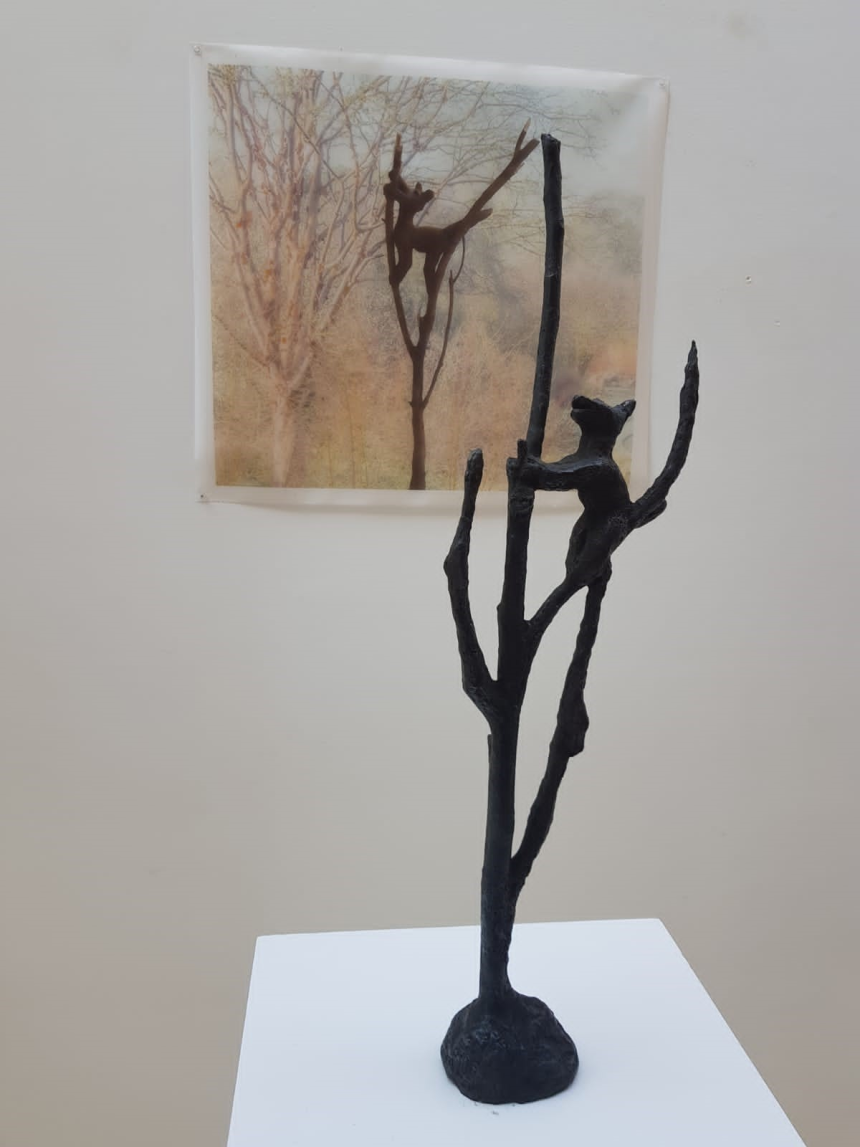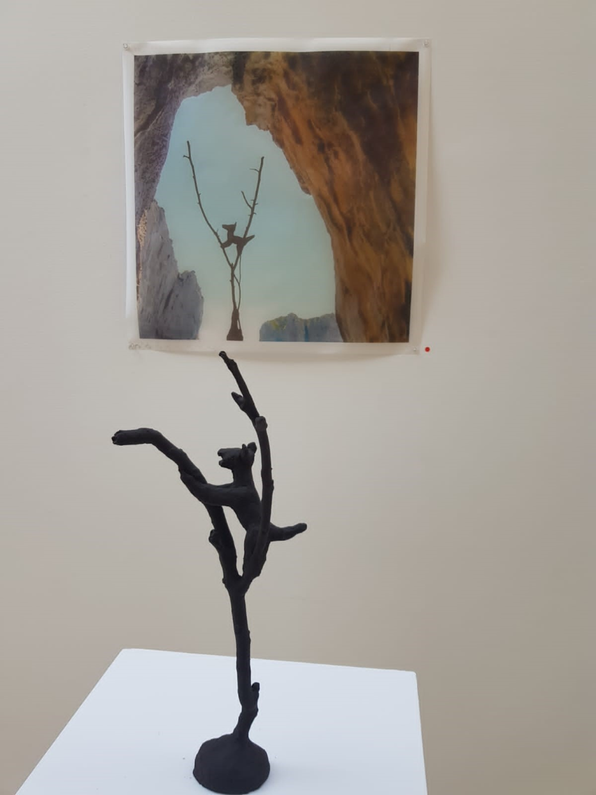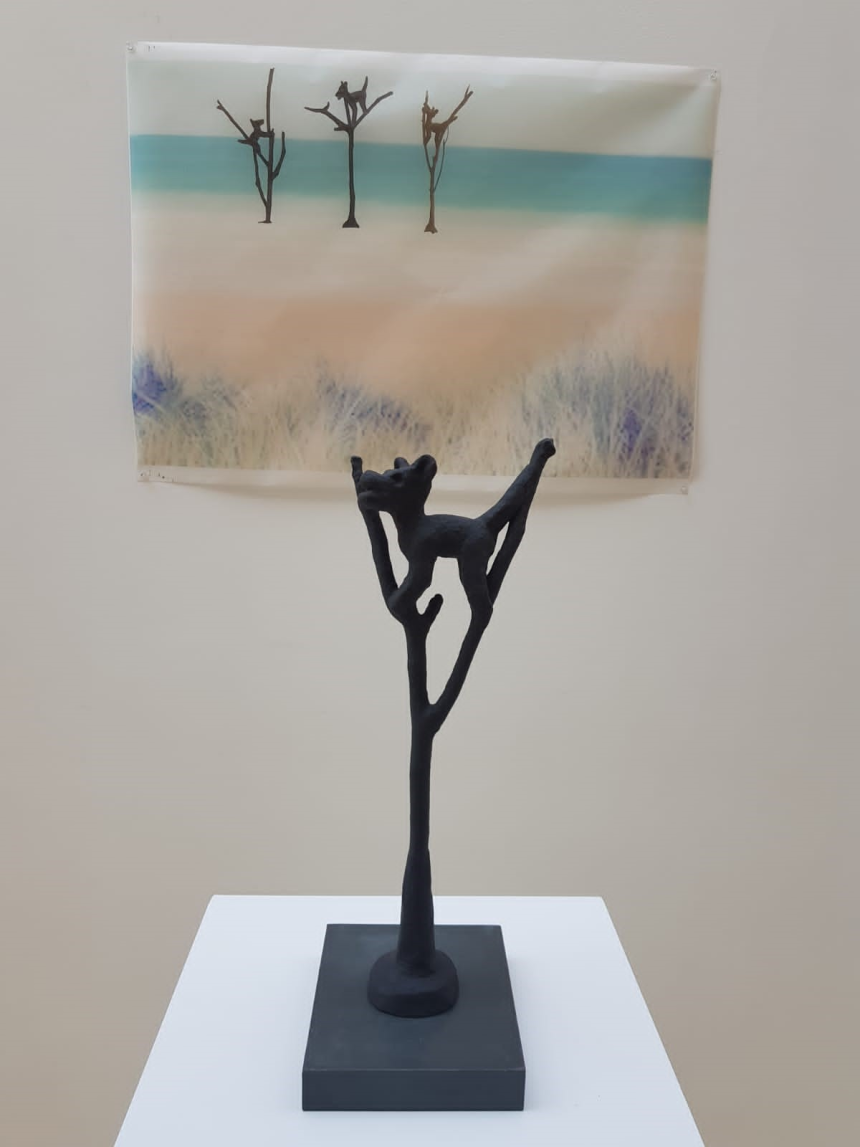 Les sculptures noires-charbon sont des branches calcinées récupérées par l’artiste sur les lieux des incendies pour faire devoir de mémoire et témoigner des souffrances infligées à la nature par la négligence et l’indigence des hommes. Ces restes d’arbres malmenés par le désastre se redressent avec la fierté des survivants et portent, en guise de drapeau, un trophée en forme de chacal, s’accrochant aux dernières branches dans un élan désespéré de survie.