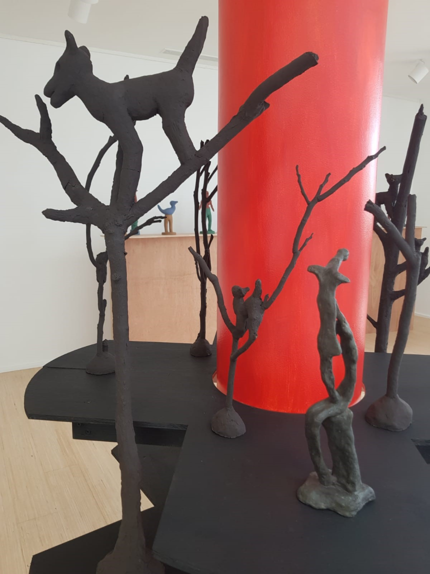 Grâce à ses sculptures et installations faites de branches brûlées et de leurs reproductions en bronze ou en résine, l’artiste plante le décor du merveilleux, nous invite dans sa forêt magique celle des contes de fées, espace enchanté peuplé d’êtres fantastiques pour une immersion dans le royaume des métamorphoses.