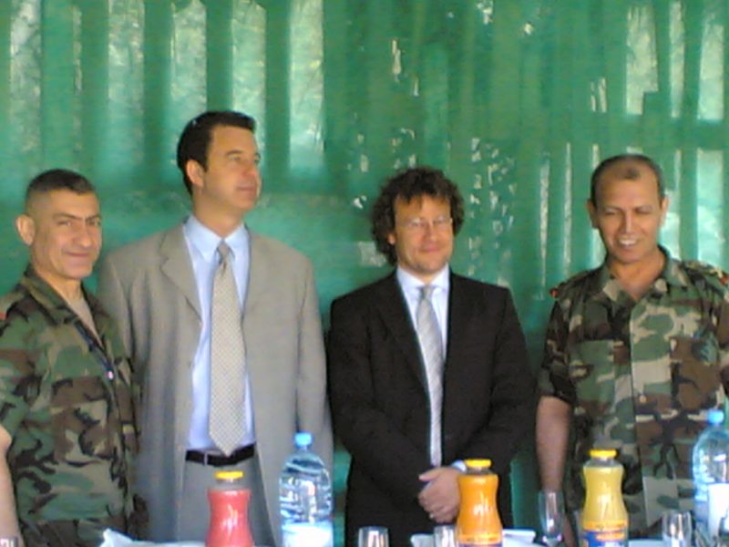 Les généraux Maroun Hitti (à l'extrême-gauche sur la photo) et François el-Hajj (à l'extrême-droite) entourant le procureur Serge Brammertz et l'enquêteur principal au sein de la Commission d’enquête Internationale Indépendante sur l'assassinat du Premier Ministre Rafic Hariri. Hansjorg Strohmeyer, le 23 Juillet 2006, à l'occasion du départ de Beyrouth de M. Strohmeyer, 10 mois avant la bataille de Nahr el-bared et 17 mois avant l'assassinat du général Hajj (Photo D.R.).