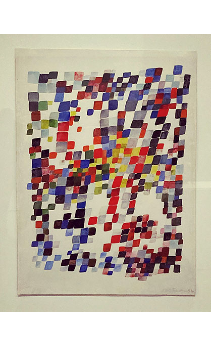 La seconde exposition met en scène chronologiquement toute la démarche artistique de la fabuleuse Sophie Taeuber Arp. Née en 1889 à Davos, cette artiste peintre, sculptrice et même danseuse, aura participé, avec son mari Jean Arp, aux mouvements Dada puis surréaliste. Son œuvre est marquée par le développement et le rythme d’une géométrie graphique, musicale, imposant même une chorégraphie des couleurs – une vision ultramoderniste à une époque ultraclassique; tous les supports nouveaux seront ainsi utilisés. En outre, elle s’essaiera au tissage, exerçant en ce sens une influence sur l’industrie textile et décorative et entraînant dans son sillage son amie Sonia Delaunay et tant d’autres qu’elle aura inspirés.