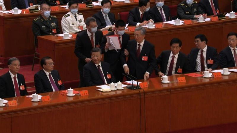 Seul incident marquant durant une cérémonie très chorégraphiée, l'ancien président Hu Jintao a été escorté vers la sortie. Visiblement contre son gré, l'homme de 79 ans, qui a présidé la Chine de 2003 à 2013, a été incité par des employés à se lever de son siège, situé à côté de Xi Jinping.
