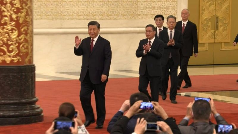 Au Palais du peuple à Pékin, l'homme de 69 ans au sourire impassible est arrivé dimanche à la tribune surmontée de la faucille et du marteau, suivi de six autres hommes nommés au sommet du pouvoir chinois, tous des proches et alliés.