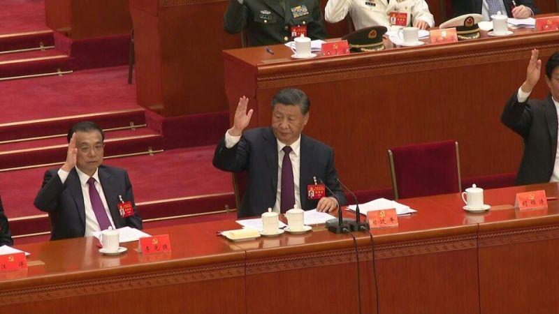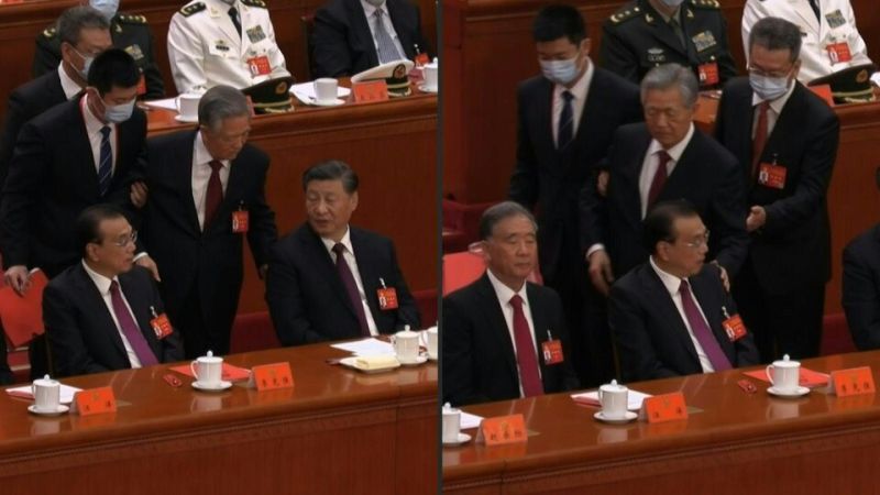 Pendant la cérémonie de clôture, Hu Jintao, qui a présidé la Chine de 2003 à 2013, est incité par des employés à se lever de son siège, situé à côté de Xi Jinping au premier rang du Palais du peuple.