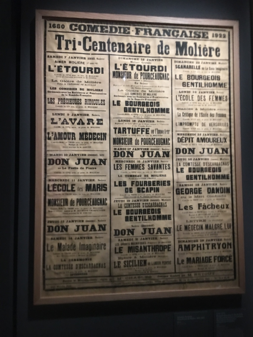 En 1680, la Comédie-Française hérite de ces principes et porte toujours le nom de «troupe de Molière». Et pourtant, Molière est décédé en 1673 et n’a jamais connu la Comédie-Française… Sur une grande colonne sont collées les affiches des pièces de Molière: L’Étourdi, Dom Juan, L’Avare, Les Fourberies de Scapin, Le Bourgeois Gentilhomme… autant de titres qui ont accompagné l’Histoire du théâtre classique au XVIIe siècle, et qui perdurent à travers les pièces jouées à la Comédie-Française et les adaptations contemporaines.