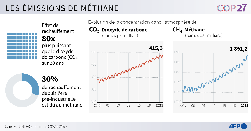 En 2020 et 2021, la concentration de méthane --deuxième plus important contributeur au réchauffement climatique-- a augmenté de respectivement 15 et 18 parties par milliard (PPB). L'origine des émissions est difficile à établir parce que les sources d'émissions et les "puits" qui absorbent le gaz peuvent se confondre, explique l'OMM.