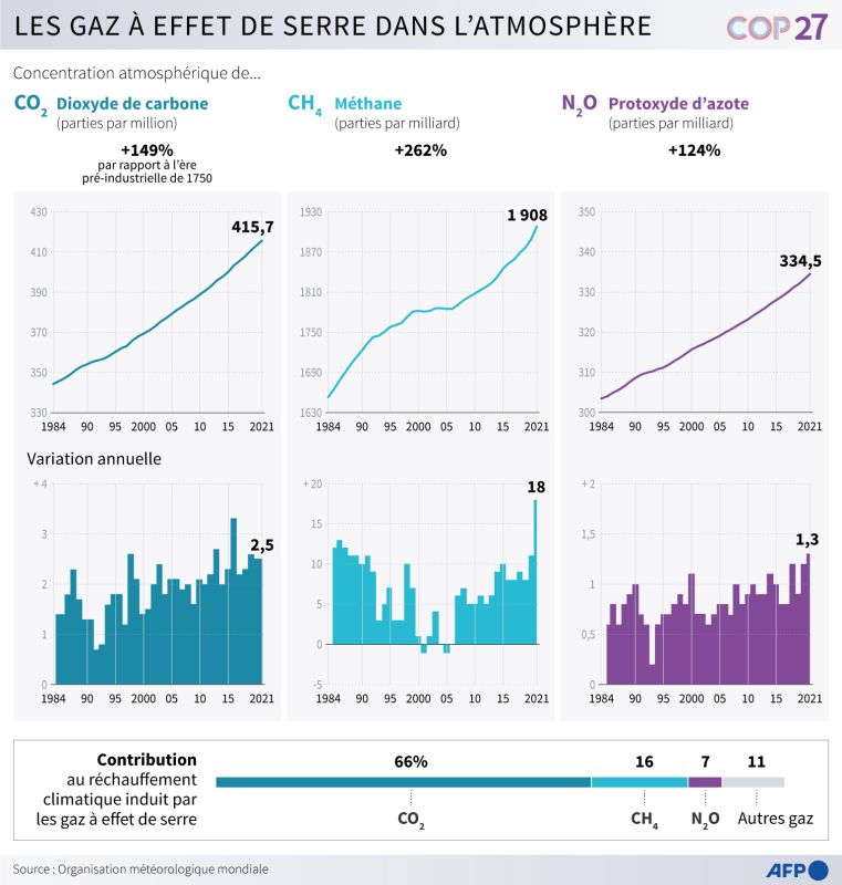 En 2021, la concentration de l'atmosphère en dioxyde de carbone s’élevait à 415,7 parties par million (ppm), celle de méthane à 1.908 parties par milliard (ppb) et celle de protoxyde d’azote à 334,5 ppb, soit une progression de 149%, 262% et 124%, respectivement, par rapport à l’époque préindustrielle.