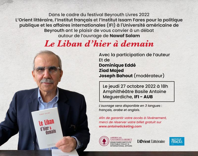 - à 18h : débat autour de l’ouvrage de Nawaf Salam Le Liban d’hier à demain, avec la participation de l’auteur, de Dominique Eddé et de Ziad Majed, modéré par Joe Bahout (Auditorium de l’Institut Issam Fares de l’Université Américaine de Beyrouth)