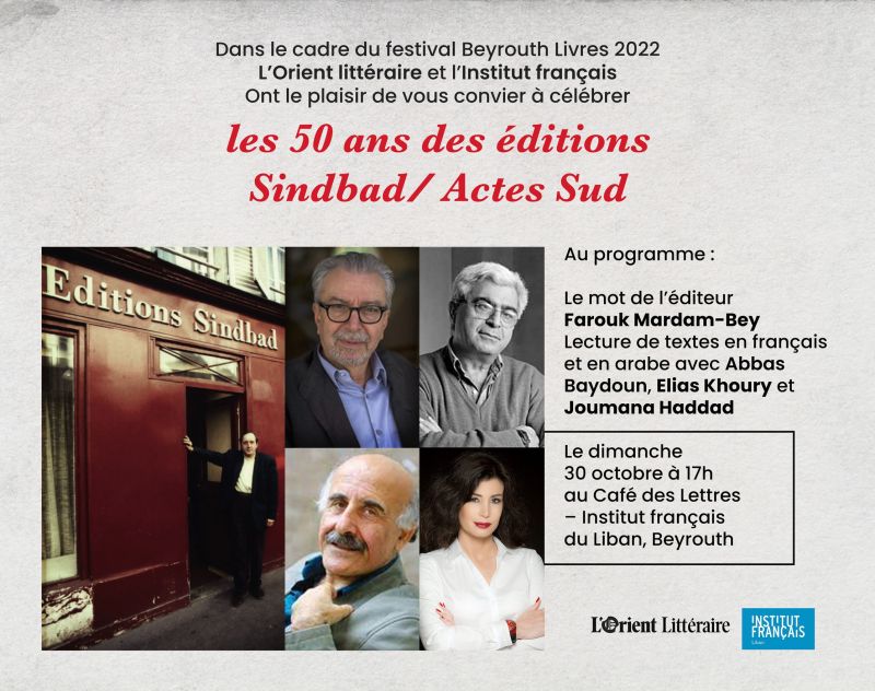 - à 17h : 50 ans de Sindbad/ Actes Sud - rencontre avec l’éditeur Farouk Mardam-Bey et lecture de textes avec Joumana Haddad, Abbas Baydoun et Elias Khoury, dimanche 30 octobre (Café des Lettres)