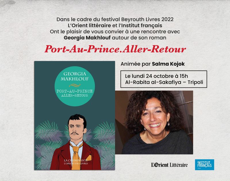 - à 15h : rencontre avec Georgia Makhlouf autour de son roman Port-Au-Prince. Aller-retour, animée par Salma Kojok (al-Rabita al-Sakafiya, Tripoli)