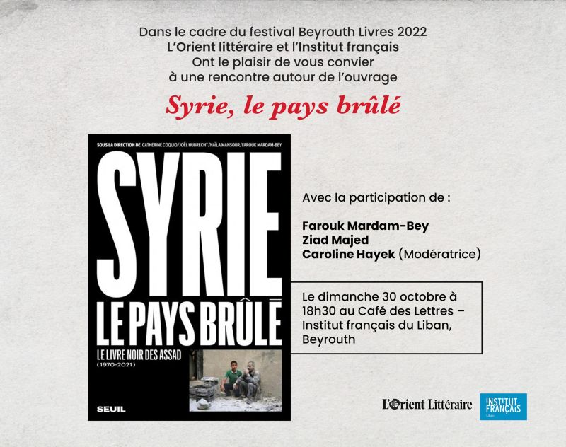 - à 18h30 : rencontre autour de l’ouvrage collectif Syrie, le pays brûlé avec Farouk Mardam-Bey et Ziad Majed, présenté par Caroline Hayek (Café des Lettres)