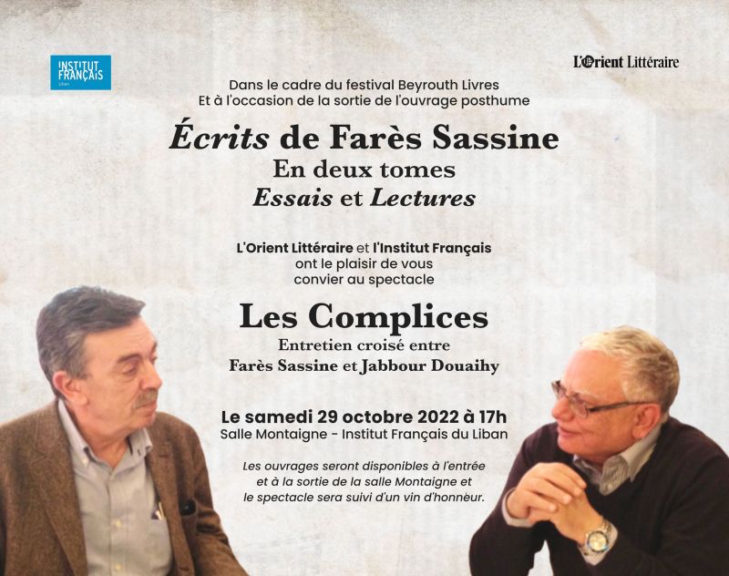 À l’occasion de la sortie de deux ouvrages inédits de Farès Sassine intitulés Écrits en deux tomes : tome 1 Essais et tome 2 Lectures aux éditions L’Orient des Livres, L’Orient Littéraire rend hommage à ses fidèles collaborateurs décédés en 2021 : Farès Sassine et Jabbour Douaihy. Il s’agit d’un entretien croisé entre les deux intellectuels mis en scène par Mirana El- Naimy et Maria Douaihy et joué par Cyril Jabre et Joe Abi Aad. Texte adapté par Alexandre Najjar. Le spectacle sera suivi de la vente des deux ouvrages de Farès Sassine.