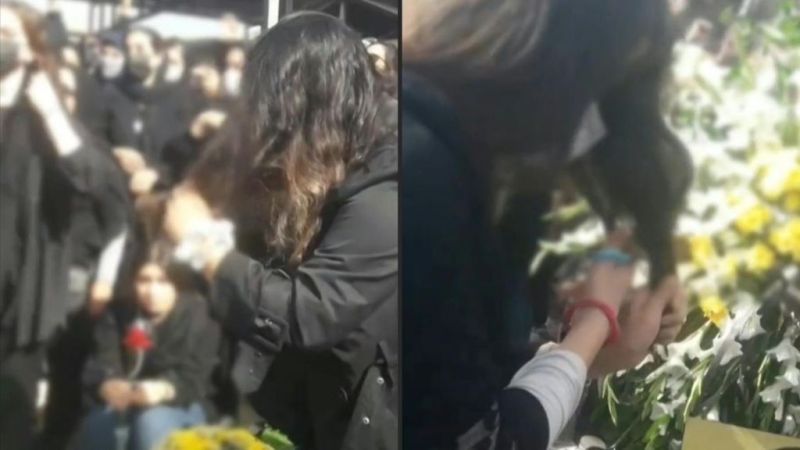 Plusieurs femmes se coupant les cheveux sur la tombe de Nika Shakarami à Khorramabad, lors du mémorial organisé en l'honneur des 40 jours écoulés depuis sa mort. (AFP)"L'année du sang"