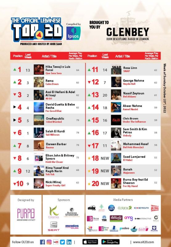 Il est à noter que la chanson Bel ahlam de Nassif Zeytoun grimpe rapidement dans le classement et se retrouve en 13ᵉ, signant ainsi la plus forte progression de la semaine.