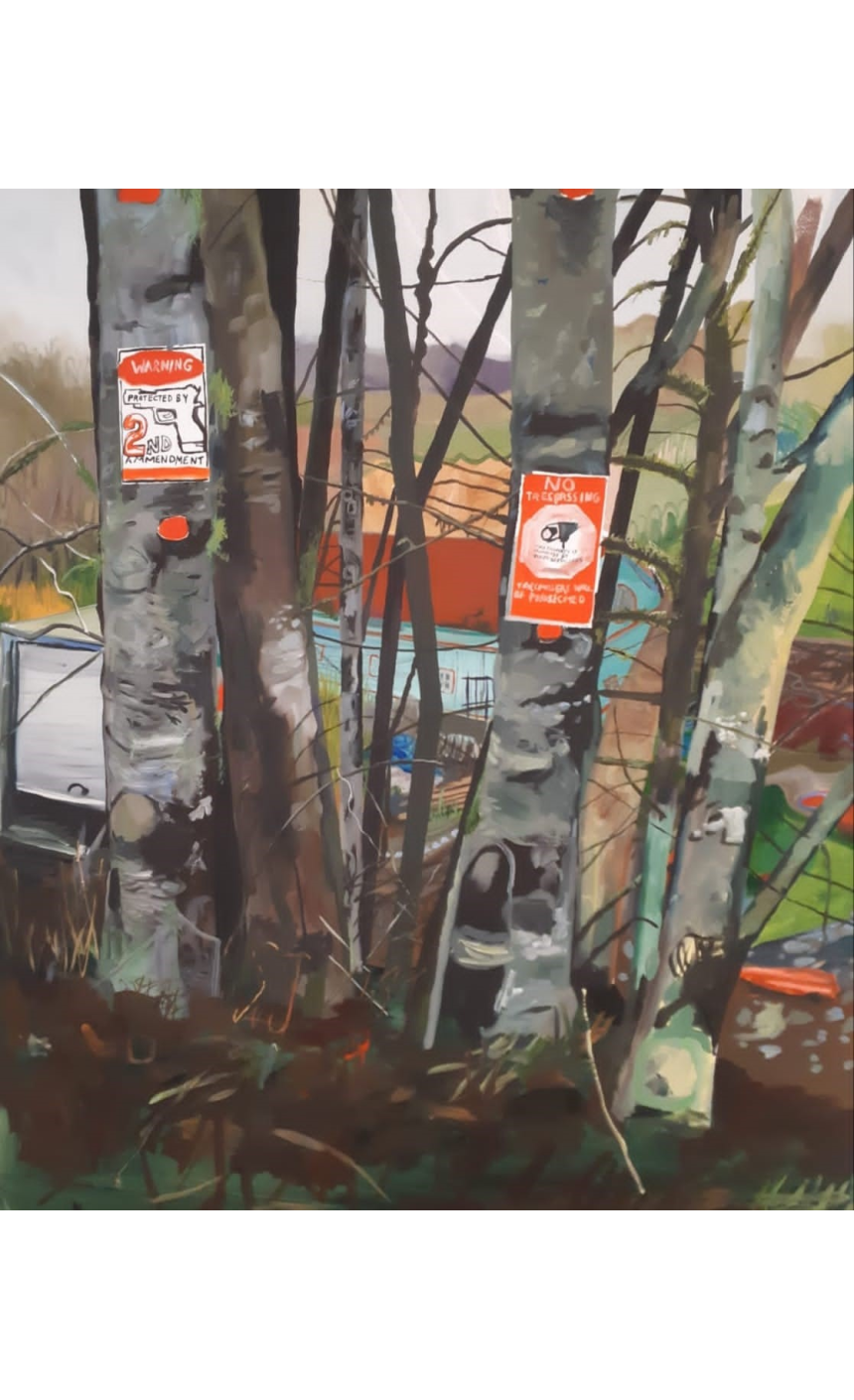 Dénonciation aussi d’une société en perte de valeurs, se heurtant à ses propres contradictions, dans les tableaux de Céleste Dupuy-Spencer. On y voit ainsi des troncs d’arbres sur lesquels sont affichées des interdictions de polluer, produisant par cela même un effet de gâchis, de défiguration de la nature et de l’environnement.