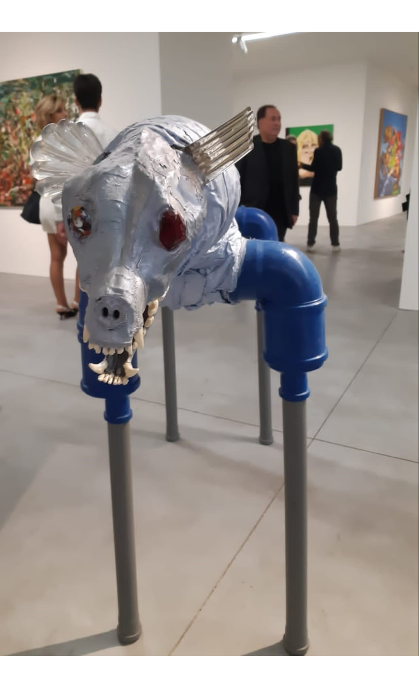 D’autres œuvres, assemblages de tuyaux de plomberie affublés d’une tête d’animal, font une nette allusion à Duchamp et au dadaïsme: l’objet de consommation est détourné de sa fonction utilitaire pour revendiquer sa place en tant qu’œuvre d’art.