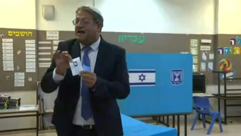 Itamar Ben-Gvir, membre de la Knesset israélienne et chef du parti d'extrême droite israélien "Pouvoir juif", vote dans un bureau de vote de la colonie de Kyriat Arba, dans la banlieue d'Hébron, en Cisjordanie occupée.