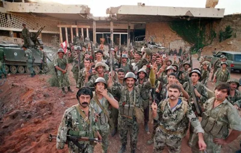 L'attitude de déni du général Michel Aoun aboutira le 13 octobre 1990 à une offensive syrienne contre le Palais de Baabda, le ministère de la Défense et la zone Est. Sur notre photo des soldats syriens posant devant l'entrée du Palais de Baabda, détruite par un bombardement syrien.