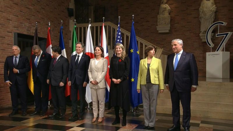 Les ministres du G7 chargés des Affaires étrangères et le chef de la diplomatie européenne Josep Borrell se réunissent pour une première session de travail concernant la guerre en Ukraine, au sein de l'hôtel de ville historique de la ville allemande de Münster.