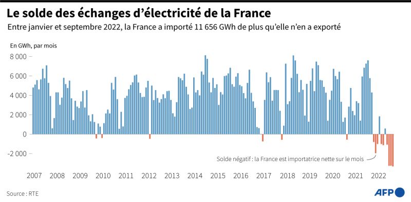 Des coupures électriques seraient "inévitables si la consommation d’électricité ne diminue pas" aux pics de la journée (entre 8H00 et 13H00 et entre 18H-20H), prévient RTE, qui prévoit janvier comme le plus à risque.