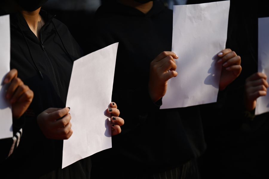 De nombreux manifestants brandissent des feuilles blanches lors des manifestations, comme symboles de la censure qui sévit sur les réseaux sociaux. (AFP)L'AFP a vu plusieurs policiers filmer les manifestants, beaucoup sans expérience, avec de petites caméras portatives lors du rassemblement de dimanche à Pékin.