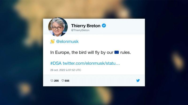 Lors de l'acquisition de Twitter, Elon Musk avait lancé:"l'oiseau bleu vole librement". La réponse du commissaire européen au Marché intérieur, Thierry Breton, ne s'est pas fait attendre...