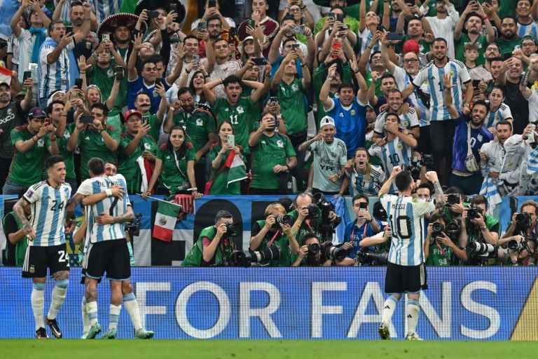 L'attaquant argentin Lionel Messi célèbre son but devant les supporters pendant le match du Mondial-2022 contre le Mexique au stade de Lusail, le 26 novembre 2022. Glyn Kirk/AFP"Vamos" Messi
