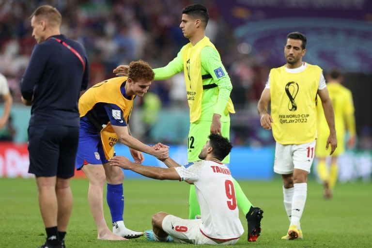 L'attaquant américain Josh Sargent (à gauche) félicite l'attaquant iranien Mehdi Taremi à la fin de la rencontre entre les deux pays lors du Mondial-2022, au stade Al-Thumama à Doha, le 29 novembre 2022. Fadel Senna/AFPDiplomatie du ballon rond