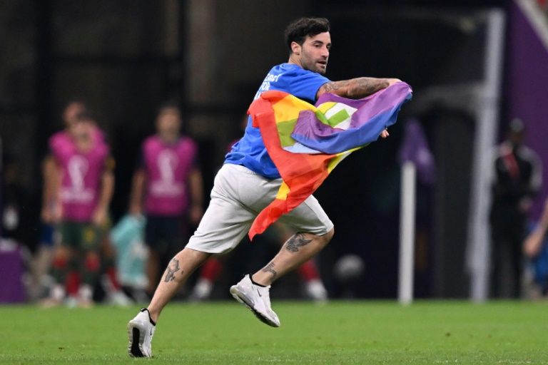 Mario Ferri, 35 ans, portant un t-shirt arborant le message "Respect pour la femme iranienne" envahit le terrain en portant un drapeau arc-en-ciel pendant le match du Mondial-2022 entre le Portugal et l'Uruguay au stade de Lusail, le 28 novembre 2022. Kirill/Kudryavtev/AFPArc-en-ciel sur le terrain