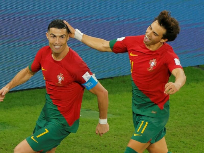 La star du Portugal Cristiano Ronaldo (à gauche) vient d'ouvrir le score sur penalty contre le Ghana, pour la plus grande joie de son coéquipier Joao Felix, le 24 novembre 2022 à Doha. Odd Andersen/AFP