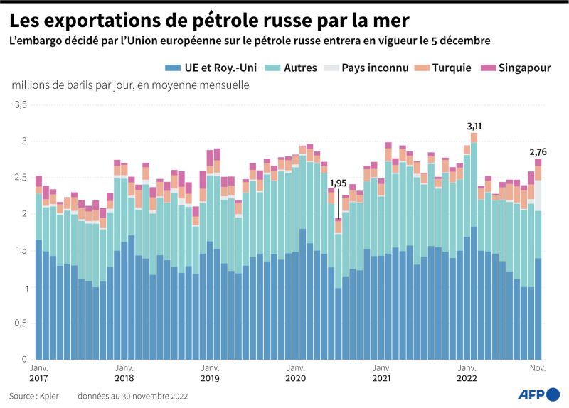 Les 27 pays de l’Union européenne se sont mis d’accord pour plafonner le prix du pétrole russe (AFP)À Kramatorsk, dans la région de Donetsk, l'AFP a entendu quatre fortes explosions samedi après-midi puis vu un énorme panache de fumée noire au-dessus de la ville. La cible des frappes restait cependant inconnue à ce stade.