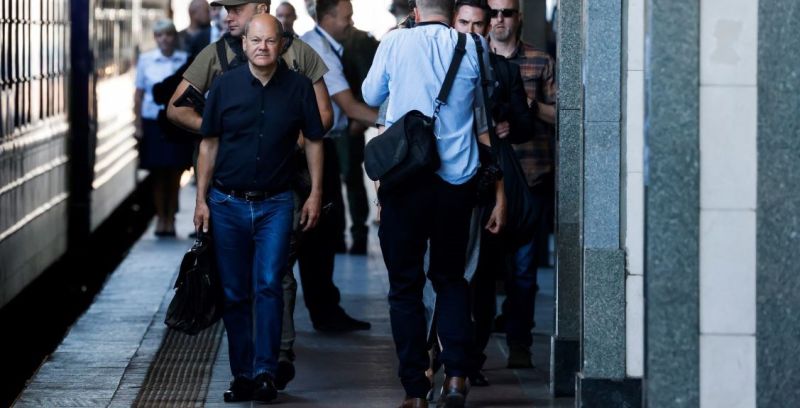 Manches courtes, jean et attaché-case qui fait plutôt cartable d'écolier: c'est en toute simplicité que Scholz est arrivé à la gare de Kiev pour une rencontre avec le président Zelensky. Seul un garde du corps et les journalistes trahissent la présence d'un chancelier.