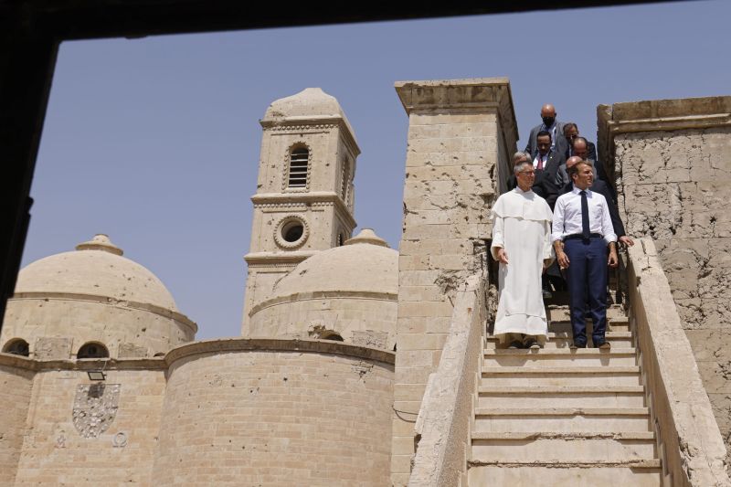 Fin août 2021, Emmanuel Macron avait visité le site de Notre-Dame de l'Heure de Mossoul (AFP)La directrice générale de l'UNESCO Audrey Azoulay a vu dans ce projet "un soutien à la société mossouliote dans sa diversité, culturelle, cultuelle, de connaissance, d'université, de librairie, il s'agit de reconstruire cet esprit, et pas uniquement des pierres".