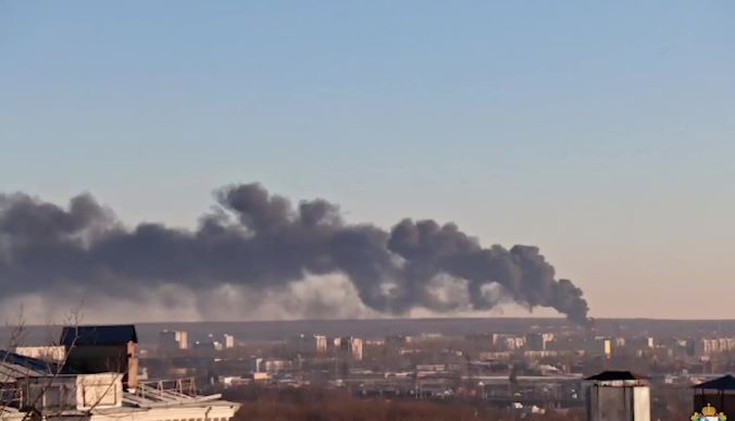 Les autorités de l'administration de la région de Koursk publient une photo sur leur compte Telegram montrant de la fumée s'élevant au-dessus du réservoir de pétrole de Koursk après une attaque présumée de l'Ukraine au drone sur l'aérodrome de la ville.Kiev n'a pas admis officiellement une quelconque responsabilité. Le porte-parole du Kremlin, Dmitri Peskov, a affirmé, sans fournir de précisions, que "des mesures nécessaires seront prises".