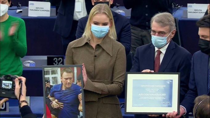 La fille de l'opposant russe emprisonné Alexei Navalny reçoit le Prix Sakharov de son père lors d'une cérémonie au Parlement européen en décembre 2021.