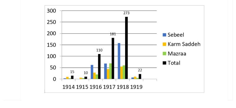 Tableau statistique des courbes des décès enregistrés à partir des registres paroissiaux des trois villages de Sebeel, de Karm Saddeh et de Mazraat al-Tufah (caza de Zgharta), entre 1914 et 1919. Courtesy cheikh Habib TorbeyDoit-on accabler Jamal pacha ou plutôt les Alliés?