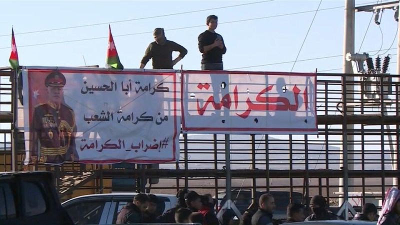 Les grèves ont débuté il y a plus d'une semaine par un mouvement des chauffeurs de poids lourds (AFP)Des chauffeurs de poids lourds ont garé leurs véhicules le long d'une autoroute et ont organisé un sit-in, selon des images diffusées par la télévision d'État Al-Mamlaka à Maan.